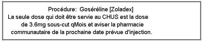 24-09-19 ML après discussion modifier le pop-up par : ATTENTION Le Zoladex régulier (q1mois) n'est pas équivalent à la forme Zoladex LA (q3mois). Seule dose permise au CHUS:3.6mg SC qmois. Substituer toute prescription de Zoladex LA 10,8 mg SC q3mois pour une dose de Zoladex 3,6 mg SC q1mois. Aviser obligatoirement la pharmacie communautaire de la prochaine date d'injection prévue en fonction de la situation.