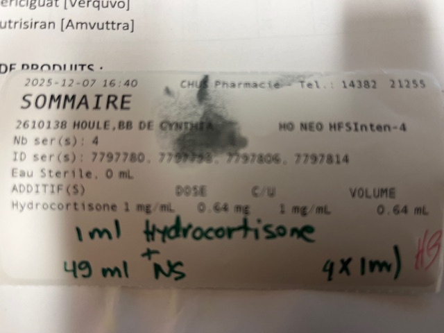 Nous avons remarqué que l’étiquette Ariane de l’hydrocortisone dilué à 1 mg/mL contient une erreur concernant le diluant utilisé. L’étiquette indique de l’eau stérile, alors que nous utilisons plutôt du NaCl 0,9 % pour la préparation.